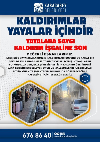 Karacabey İlçesinde ikamet eden vatandaşların kaldırım ve yol işgaline tepkisi sonucunda, Karacabey Belediyesi Zabıta ekipleri tarafından 'kaldırım işgali' denetimi sıkılaştırıldı. Denetimlerde, engelli rampalarının önüne park edilen araçlar kaldırılarak araç sahipleri uyarıldı. Ayrıca vatandaşlara kaldırımda yürürken engel teşkil eden işyeri önü reklam tabelaları, duba bulunduran, satışı yapılacak ürünleri sergileyen, işyerleri hakkında tespit tutanağı düzenlenerek esnaf uyarıldı.