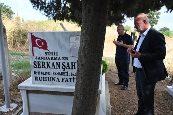 Ziyaretin ardından Başkan Karabatı ve İlçe Başkanı Saygısever, şehit Serkan Şahin’in kabri başına giderek dua etti. Burada da duygularını paylaşan Karabatı, “Vatan toprağı için gözünü kırpmadan şehadet şerbetini içen aziz kahramanlarımızı rahmet, minnet ve şükranla anıyorum. Onlar sayesinde bu topraklarda özgürce yaşıyoruz. Aziz şehitlerimizin ruhu şad, mekânları cennet olsun.” dedi.