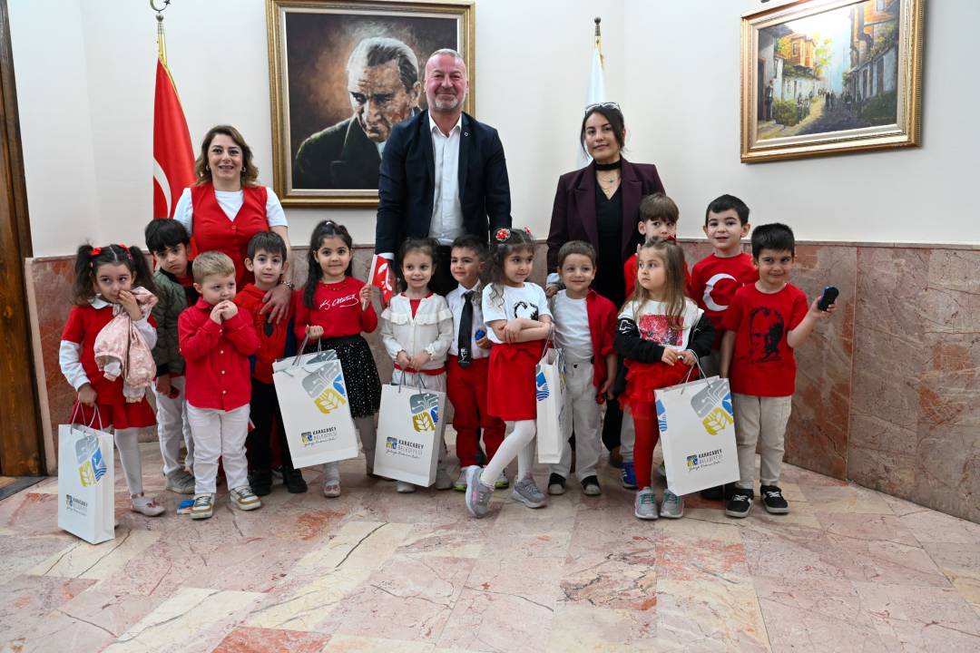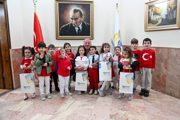 Karacabey’de faaliyet gösteren Gözde Çocuklar Anaokulu’nun öğrencileri, 23 Nisan Ulusal Egemenlik ve Çocuk Bayramı öncesinde Karacabey Belediye Başkanı Fatih Karabatı’yı makamında ziyaret etti. Renkli ve neşeli anlara sahne olan ziyarette minikler, hem Belediye Başkanı’na sorular sordular hem de çeşitli isteklerini dile getirdiler.