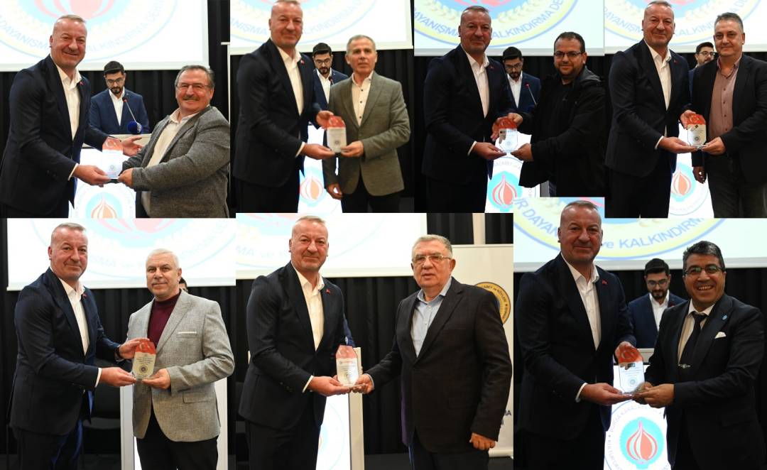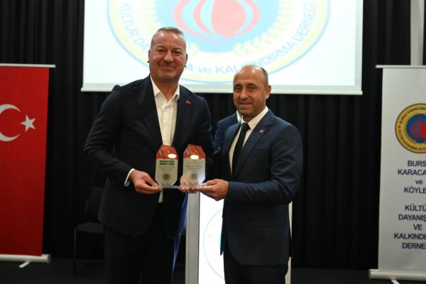 Konuşmaların ardından Dernek Başkanı Erkan Bilör, Karacabey’e ve derneğe katkılarından dolayı Belediye Başkanı Fatih Karabatı’ya plaket takdim etti.
